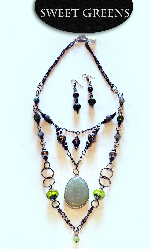 This is a fabulous statement set. The large pendant is pale green agate. The chains are combinations of antique bronze chain, silver craved spacers, lime green pandora style beads, green, blue and purple Czech glass beads, purple crystals, and antique Bali style spacers with copper Greek drop charms. The earrings are antique bronze beads, Bali style spacers with copper Greek drop charms. Make a grand entrance!
