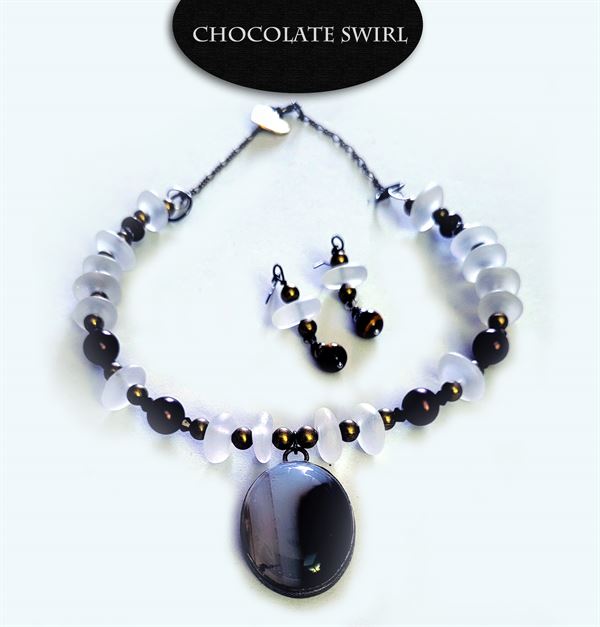 This is a white and chocolate brown, agate pendant. The chocker is made of white frosted glss with antique bronze spacers, brown pearls, brown crystals and silver spacers. The earrings are brown agate, with tigers eye beads, white frosted glass and bronze spacers. Classy and earthy!
