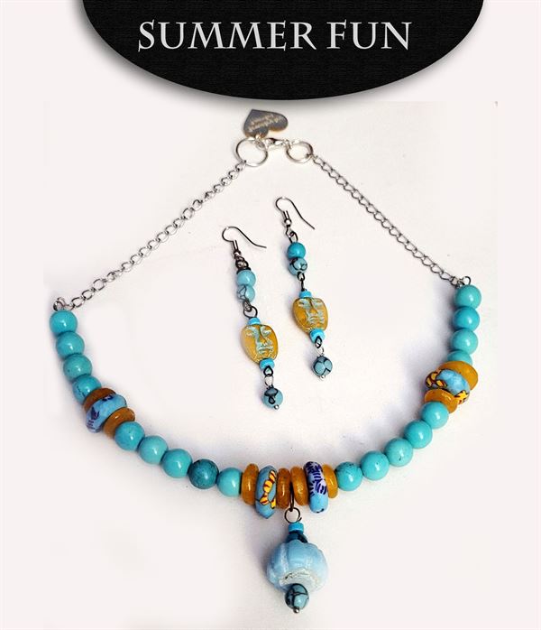 Bright howlite turquoise with orange frosted glass spacers, and African glass multi colored mini donut beads, with a turquoise clay larimar pendant make up this half choker necklace. The earrings are orange mask beads with turquoise accents and howlite turquoise spacers. Playful summer colors for the season.
