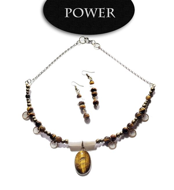 The stone for strength is Tigers Eye. The choker has a tigers eye pendant. with white barrel quartz beads, antique bronze spacers, and tigers eye beads. Pretty capriz shell coin focal beads. The earrings are tigers eye, with white quartz.