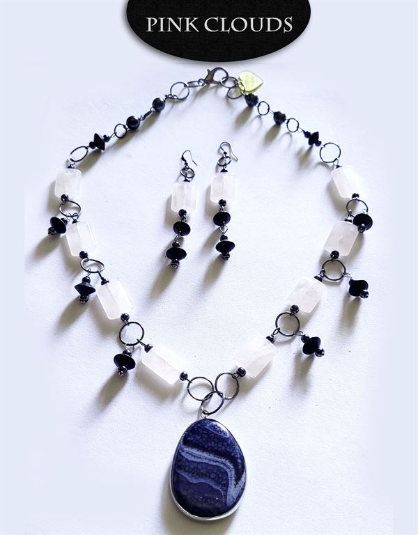 Beautiful rose quartz rectangular beads, black saucer beads, hematite tips, and gunmetal rings. The pendant is black agate. the earrings are black saucer beads, hematite tips and rose quartz rectangular beads. A great combination.