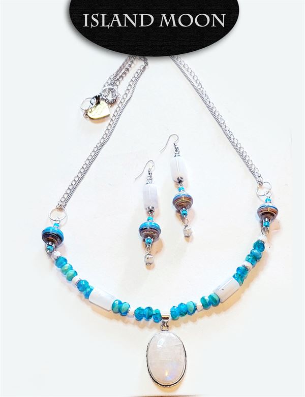 This half moon choker features a beautiful rainbow moonstone, paired with white quartz barrel beads, turquoise aqua rondelles, Czech glass Cathedral beads and spiral saucer beads with a double chain finish. The earrings are white quartz barrel beads, silver tips, spiral saucer beads with turquoise tips and Czech glass Cathedral beads. Perfect spring/summer combination.